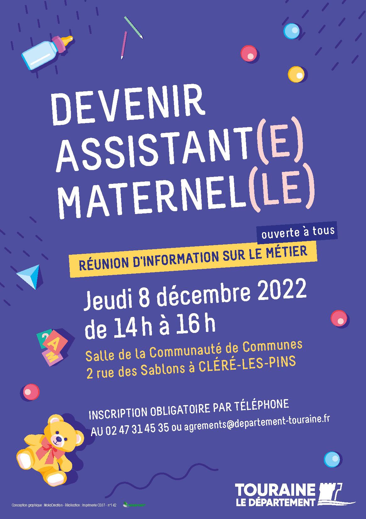 Le service Agréments du Conseil départemental d’Indre-et-Loire organise une réunion d’information ouverte à tous le jeudi 8 décembre de14h à 16h à la Salle de la Communauté de Communes, 2 rue des Sablons à Cléré-les-Pins.